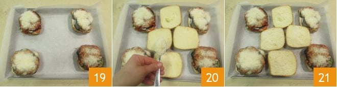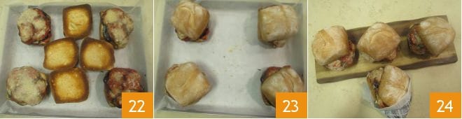 Lassen Sie das Brot nur goldgelb werden, aber nicht verbrennen 22. Dann verbinden Sie die entsprechenden Oberseiten mit den gefüllten Hälften 23 und Ihre Parmigiana im Brötchen ist bereit zum Servieren 24.