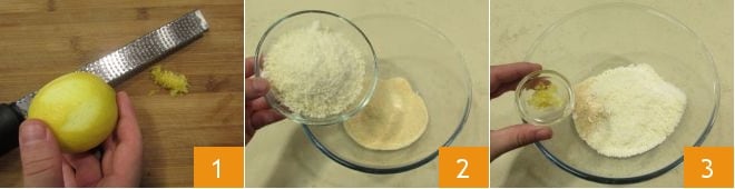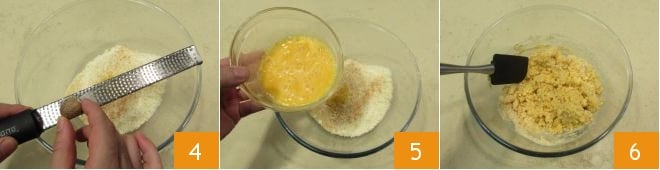 Um die Passatelli mit Apfelragout zuzubereiten, beginnen Sie damit, eine gute Fleischbrühe auf dem Herd zu erhitzen (Sie können auch eine Gemüsebrühe zubereiten, wenn Sie einen milderen Geschmack bevorzugen). Während sie kocht, widmen Sie sich dem Teig für die Passatelli: Reiben Sie die Zitronenschale ab 1, achten Sie darauf, nicht auch das weiße, bittere Innere zu erwischen, und legen Sie sie beiseite. Geben Sie in eine Schüssel die Semmelbrösel und den geriebenen Parmesankäse 2, fügen Sie auch die Zitronenschale hinzu 3,