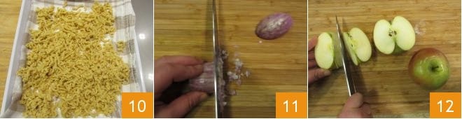 Während Sie sie formen, legen Sie sie auf ein mit einem leicht bemehlten Tuch ausgelegtes Tablett 10. Legen Sie die Passatelli beiseite und kümmern Sie sich um das Apfelragout: Schälen und hacken Sie eine Schalotte 11, waschen und trocknen Sie die Äpfel, dann vierteln Sie sie 12
