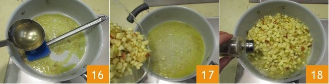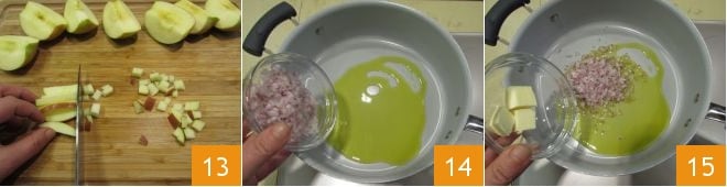 Lassen Sie die Schalotte bei schwacher Hitze 4-5 Minuten anbraten, dann geben Sie einen Schöpflöffel Brühe hinzu 16, fügen Sie die gewürfelten Äpfel hinzu 17, salzen und pfeffern Sie 18 und lassen Sie alles 10 Minuten bei schwacher Hitze kochen.