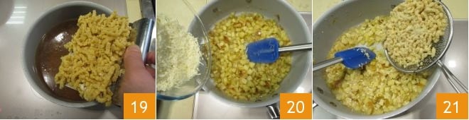 In der Zwischenzeit bringen Sie die Fleischbrühe zum Kochen und geben Sie die Passatelli hinein 19, kochen Sie, bis sie an die Oberfläche steigen, was nur wenige Minuten dauern wird. In der Zwischenzeit wird das Ragout fertig sein, schalten Sie die Hitze aus und würzen Sie mit der Hälfte des geriebenen Fossa-Käses 20. Heben Sie die Passatelli mit einem Schaumlöffel direkt in den Topf mit dem Apfelragout 21.