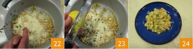 Würzen Sie erneut mit dem restlichen Fossa-Käse, den Majoranblättern 22 und der geriebenen Zitronenschale 23 und servieren Sie die Passatelli mit Apfelragout heiß 24.