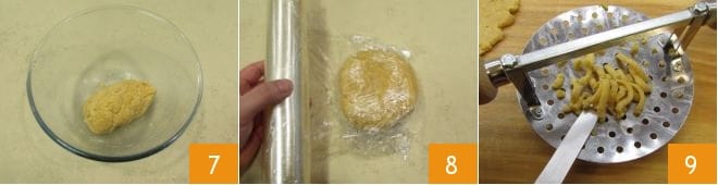 und arbeiten Sie weiter, bis Sie einen elastischen und kompakten Teigball 7 erhalten. Sollte er zu trocken sein, fügen Sie ein wenig Brühe hinzu, ansonsten, wenn er zu weich ist, noch etwas Semmelbrösel. Wickeln Sie den Teigball in Frischhaltefolie und lassen Sie ihn mindestens 2 Stunden bei Raumtemperatur ruhen 8. Dies wird den Teig kompakter machen und verhindern, dass die Passatelli beim Kochen auseinanderfallen. Nach dieser Zeit entfernen Sie die Folie vom Teigball und legen ihn auf eine leicht bemehlte Arbeitsfläche, bestäuben auch die Oberfläche mit ein wenig Mehl und formen Sie dann die Passatelli mit dem typischen Eisen. Um sie zu bekommen, müssen Sie gleichzeitig drücken und ziehen, so dass der verlängerte Teig aus den kleinen Löchern herauskommt. Anschließend trennen Sie sie mit einem Messer und schneiden Sie sie auf eine Länge von 4 cm 9.