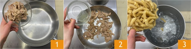 Um die Pasta mit Thunfisch ohne Tomatensauce zuzubereiten, geben Sie als erstes den gut abgetropften Thunfisch in eine Pfanne 1, erwärmen Sie ihn ein paar Minuten bei schwacher Hitze und fügen Sie den Zitronensaft hinzu 2. Kochen Sie die Nudeln in reichlich gesalzenem, kochendem Wasser 3.
