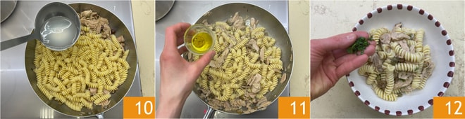 Wenn das Dressing nicht cremig genug ist, fügen Sie eine Kelle Nudelkochwasser hinzu 10 und mischen Sie. Schalten Sie die Hitze aus, fügen Sie das Öl hinzu 11 und mischen Sie. Servieren Sie und vervollständigen Sie mit gehackter Petersilie 12.