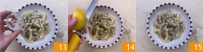 Vervollständigen Sie mit etwas getrocknetem Chili 13 und Zitronenschale 14. Ihre Pasta mit Thunfisch ohne Tomatensauce ist bereit zum Genuss 15.
