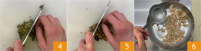 In der Zwischenzeit hacken Sie die Kapern 4 und Oliven 5 mit dem Messer. Fügen Sie eine Kelle Nudelkochwasser in die Pfanne 6 hinzu.