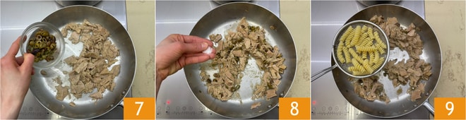 Fügen Sie die Kapern und Oliven hinzu 7, würzen Sie mit Salz 8 und mischen Sie alles, um die Zutaten zu verbinden. Lassen Sie die Nudeln direkt in der Pfanne abtropfen 9.