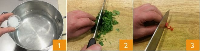 Um die Pasta alla Carrettiera zuzubereiten, geben Sie das Wasser in einen großen Topf, salzen Sie es nach Belieben und bringen es zum Kochen 1. Hacken Sie dann ein Büschel Petersilie 2 und die frische Chili 3.