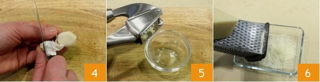 Schälen Sie die Knoblauchzehe 4, entfernen Sie den inneren grünen Keim und hacken Sie sie 5; reiben Sie dann den Pecorino 6.