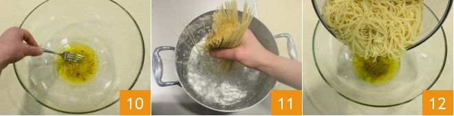 Vermischen Sie die Emulsion mit einer Gabel 10. Währenddessen, wenn das Wasser kocht, kochen Sie die Spaghetti 11, dann lassen Sie sie al dente abtropfen, bewahren Sie das Kochwasser auf und geben Sie sie in die Schüssel mit der Mischung aus Öl, Knoblauch und Chili 12.