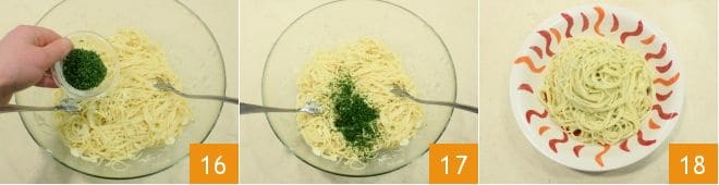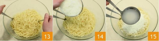 Mischen Sie die Spaghetti schnell 13 und fügen Sie den geriebenen Pecorino 14 und eine Kelle Kochwasser hinzu 15.