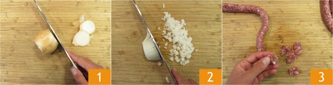 Um die Pasta alla Norcina zuzubereiten, schälen 1 und hacken Sie die Zwiebel fein 2. Schneiden Sie die Wurst leicht ein, entfernen Sie die Pelle und zerbröckeln Sie sie grob mit den Händen 3.