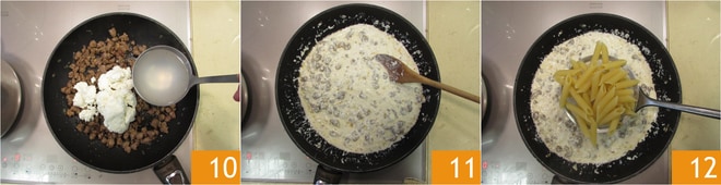 Fügen Sie eine Kelle Kochwasser der Pasta hinzu 10 und mischen Sie 11. Lassen Sie die Pasta al dente direkt in die Pfanne mit der Sauce abtropfen 12 und braten Sie sie bei starker Hitze 2 Minuten lang.