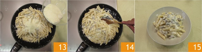 Beenden Sie die Zubereitung mit der Zugabe des Parmesans 13, mischen Sie gut 14 und servieren Sie die Pasta alla Norcina heiß 15!
