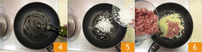Gießen Sie einen Schuss Öl in eine Pfanne 4, fügen Sie die gehackte Zwiebel 5 und die Knoblauchzehe hinzu und lassen Sie sie bei mittlerer Hitze etwa 5 Minuten anbraten. Geben Sie die zerbröckelte Wurst zur Zwiebel 6 und braten Sie sie bei mäßiger Hitze weitere 5 Minuten, bis sie gut gebräunt ist. In der Zwischenzeit stellen Sie einen Topf mit Wasser auf den Herd und salzen ihn, wenn das Wasser kocht, um die Pasta zu kochen.