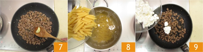 Entfernen Sie den Knoblauch und schalten Sie den Herd aus 7. Kochen Sie die Pasta al dente 8. Geben Sie den Schafskäse Ricotta in die Pfanne 9.