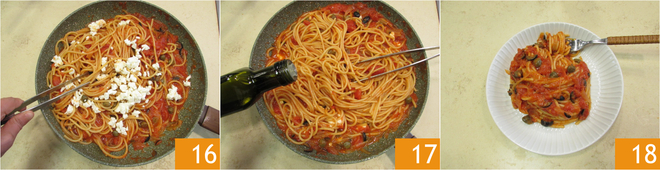 Rühren Sie schnell um, dann würzen Sie mit Oregano 16 und rühren Sie erneut um. Ein Spritzer rohes Öl, rühren Sie erneut um 17 und die Pasta alla Vesuviana ist fertig 18!