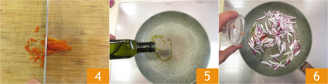 Hacken Sie die Chilischote 4 und legen Sie sie beiseite. Erhitzen Sie etwas Öl in einer Pfanne 5, fügen Sie die Zwiebeln und die Chilischote hinzu 6 und lassen Sie sie 5 Minuten bei mittlerer Hitze anbraten.