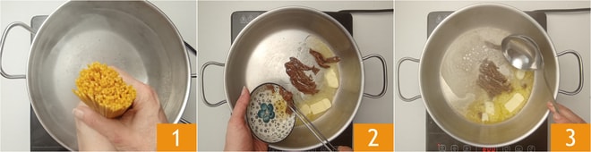 Um die Pasta mit Butter und Sardellen zuzubereiten, kochen Sie zunächst die Pasta in gesalzenem, kochendem Wasser 1. Geben Sie 60 g Butter in einen Topf, fügen Sie 60 g Sardellen 2 und eine Kelle Nudelkochwasser hinzu 3. Lassen Sie Butter und Sardellen bei schwacher Hitze schmelzen.