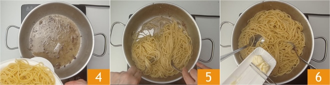 Sobald die Pasta gekocht ist, gießen Sie sie ab, aber bewahren Sie das Kochwasser auf, und geben Sie sie in den Topf mit Butter und Sardellen 4. Vermischen Sie alles gut 5, sodass die Sauce die Pasta umhüllt. Schalten Sie die Hitze aus und fügen Sie die restliche Butter hinzu 6.