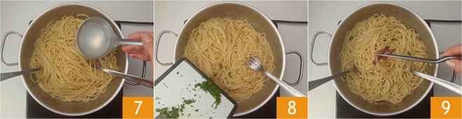 Fügen Sie auch eine Kelle Nudelkochwasser hinzu 7 und vermischen Sie alles. Fügen Sie die fein gehackte Petersilie 8 und die restlichen Sardellenfilets hinzu 9. Servieren Sie die Pasta und vervollständigen Sie das Gericht mit einem Löffel Sauce, die am Boden des Topfes verbleibt. Ihre Pasta mit Butter und Sardellen ist bereit zum Genießen!