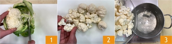Um die Nudeln mit Blumenkohl und Safran zuzubereiten, reinigen Sie zuerst den Blumenkohl: Entfernen Sie die Blätter und den zentralen Strunk 1, dann teilen Sie die Röschen und schneiden Sie sie in kleinere Stücke 2. Bringen Sie einen Topf mit gesalzenem Wasser zum Kochen, geben Sie die Blumenkohlröschen hinzu und kochen Sie sie 5 Minuten lang 3.