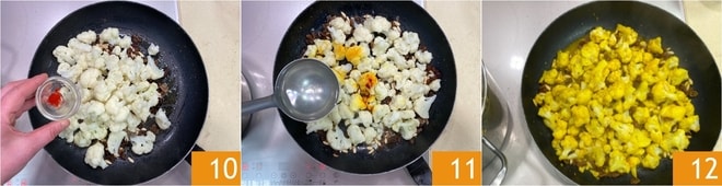 Geben Sie das Safranpulver hinzu 10 zusammen mit einer Kelle Kochwasser des Blumenkohls 11, mischen Sie es, um es aufzulösen und zu vermengen 12.