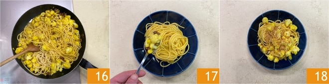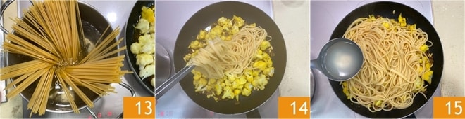 Kochen Sie die Spaghetti im gleichen Wasser, das für das Kochen des Blumenkohls verwendet wurde 13. Wenn die Nudeln al dente sind, abgießen und in die Pfanne mit der Sauce geben 14 und eine Kelle des Kochwassers hinzufügen 15.