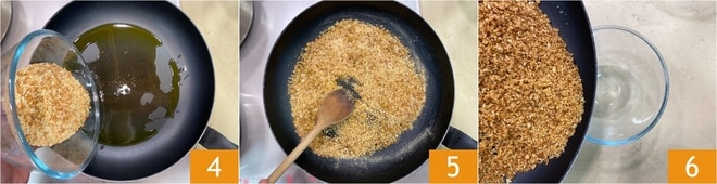Erhitzen Sie in der Zwischenzeit etwas Öl in einer Pfanne, geben Sie das Paniermehl hinzu 4 und rösten Sie es für ein paar Minuten 5, bis es goldbraun ist. Geben Sie das geröstete Paniermehl in eine Schüssel und stellen Sie es beiseite 6.