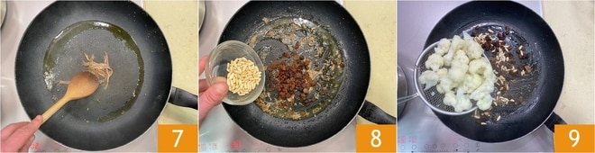 In der gleichen Pfanne die eingelegten Sardellen schmelzen 7, dann die Rosinen und Pinienkerne hinzufügen 8. Nach 5 Minuten die Blumenkohlröschen abgießen 9, wobei das Kochwasser aufbewahrt wird.