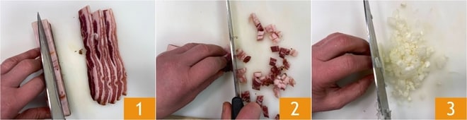 Um die Nudeln mit Speck zuzubereiten, schneiden Sie zuerst den Speck in Scheiben 1, dann in Streifen und schließlich in Würfel 2. Putzen und hacken Sie die Zwiebel 3.