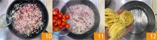Löschen Sie mit dem Weißwein ab 10 und lassen Sie ihn komplett verdampfen, dann fügen Sie die Kirschtomaten hinzu 11 und kochen bei mittlerer Hitze etwa zehn Minuten. In der Zwischenzeit bringen Sie einen Topf mit Salzwasser zum Kochen und geben die Tagliatelle hinein 12.
