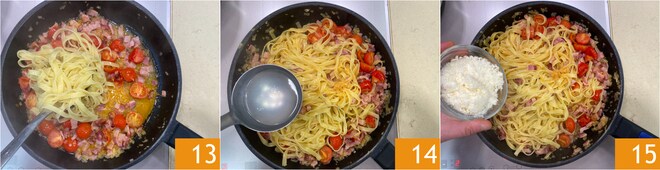 Gießen Sie die Nudeln direkt in die Sauce 13 und schwenken Sie sie in der Pfanne, gegebenenfalls mit einem Schöpflöffel Kochwasser 14. Würzen Sie mit geriebenem Parmigiano 15.