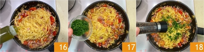 Geben Sie einen Spritzer Öl dazu 16, dann würzen Sie mit gehackter Petersilie 17 und einer Prise Pfeffer 18. Mischen Sie alles gut durch und schalten Sie den Herd aus.
