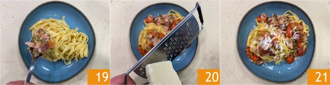 Richten Sie die Nudeln an 19 und vervollständigen Sie mit geriebenem Pecorino 20. Ihre Nudeln mit Speck sind servierfertig 21!