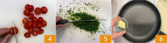 Waschen Sie die Kirschtomaten und halbieren Sie sie 4, dann hacken Sie die Petersilie fein 5. Lassen Sie die Butter in einer großen Pfanne schmelzen 6.