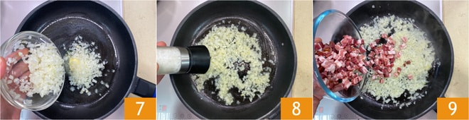Fügen Sie die Zwiebel hinzu 7, salzen Sie 8 und lassen Sie sie schmoren, dann geben Sie den Speck dazu 9 und braten ihn ein paar Minuten an.