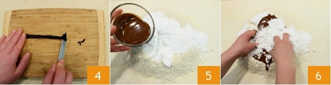 schneiden Sie dann eine Vanilleschote auf und schaben Sie mit der Messerklinge die Samen aus 4. Geben Sie sie in die Mitte des Brunnens; fügen Sie auch den Puderzucker und die Haselnusspaste hinzu 5 und beginnen Sie schnell zu kneten 6, bis Sie eine kompakte und glatte Konsistenz erhalten.