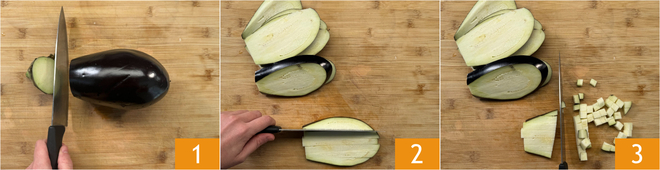 Um die Pasta mit Auberginen zuzubereiten, kümmern Sie sich zuerst um die Auberginen: waschen Sie sie, schneiden Sie die Enden ab und schneiden Sie sie zuerst in Scheiben 1, dann in Stifte 2 und schließlich in Würfel von etwa 1 cm 3.