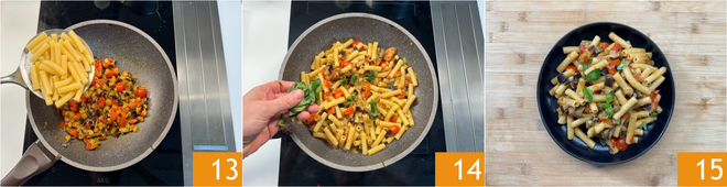 Wenn die Pasta al dente ist, lassen Sie sie abtropfen 12 und geben Sie sie direkt in den Topf mit den Auberginen 13. Schwenken Sie alles für ein paar Minuten, indem Sie etwas Kochwasser hinzufügen, um es gut zu vermischen, und garnieren Sie es dann mit Basilikumblättern 14. Jetzt müssen Sie nur noch Ihre Pasta mit Auberginen anrichten 15!