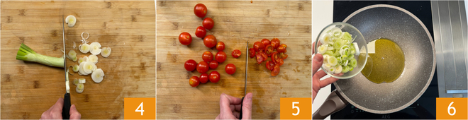 Schälen und schneiden Sie die Frühlingszwiebel zuerst in der Mitte und dann in dünne Ringe 4. Waschen und vierteln Sie die Kirschtomaten 5. Erhitzen Sie das Öl in einem Topf und fügen Sie dann die Frühlingszwiebel hinzu 6.