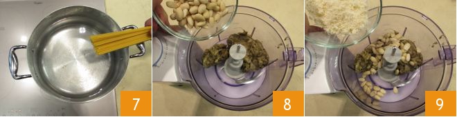 Zu diesem Zeitpunkt hat das Wasser im Topf den Siedepunkt erreicht, daher kochen Sie die Bavette 7 und setzen Sie in der Zwischenzeit die Zubereitung des Auberginenpestos fort. Geben Sie das Auberginenfleisch in einen Mixer mit Klingen und fügen Sie die geschälten Mandeln 8, den geriebenen Parmesan 9 hinzu,