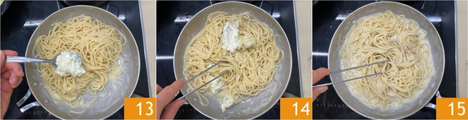 Schwenken Sie die Pasta, fügen Sie dann fast den gesamten Gorgonzola hinzu 13. Rühren Sie gut bei ausgeschaltetem Herd 14, bis er geschmolzen ist 15 und die Pasta gut durchmischt ist.