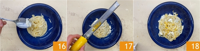 Richten Sie die Pasta an, garnieren Sie mit den Birnenwürfeln, einigen Gorgonzola-Klecksen 16 und geriebener Orangenschale 17. Servieren Sie sofort Ihre Pasta mit Birnen und Gorgonzola 18!