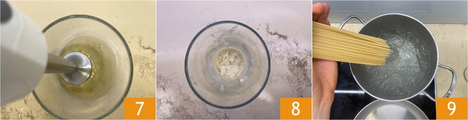 Nun geben Sie fast alle Birnen in einen hohen und schmalen Behälter (behalten Sie einige für die Dekoration des Gerichts zurück) und pürieren Sie sie mit einem Stabmixer 7 bis Sie ein Püree erhalten 8. Lassen Sie in diesem Moment die Spaghetti in reichlich gesalzenem, kochendem Wasser 9.