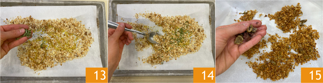 Nun widmen Sie sich den Semmelbröseln: Verteilen Sie sie auf einem mit Backpapier ausgelegten Backblech 10, dann würzen Sie mit Öl 11 und Salz 12.