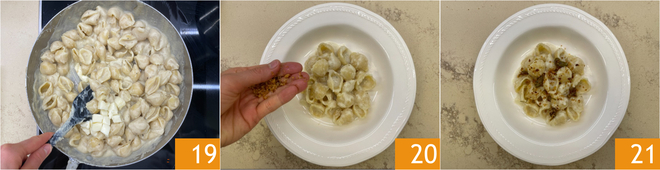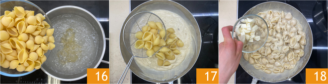 An diesem Punkt kochen Sie die Pasta in kochendem Salzwasser 16. Lassen Sie die Pasta al dente abtropfen und geben Sie sie in die Pfanne mit der Blumenkohlcreme 17, dann schwenken Sie alles kurz, um es zu mischen, indem Sie mit einer Kelle Kochwasser verlängern. Schalten Sie die Hitze aus und fügen Sie in Würfel geschnittenen Taleggio hinzu 18.