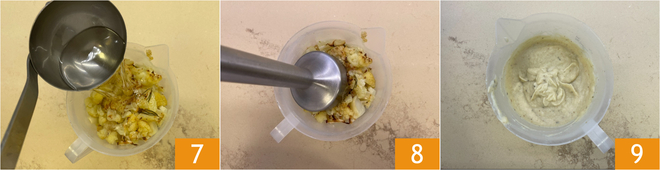Geben Sie den Blumenkohl in einen Becher zusammen mit einer Kelle heißem Wasser 7, dann pürieren Sie mit einem Stabmixer 8, um eine glatte und homogene Creme zu erhalten 9. Geben Sie die Blumenkohlcreme in eine große Pfanne und stellen Sie sie beiseite.