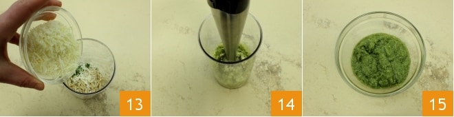 den geriebenen Ricotta Salata und Tilsiter 13, eine Prise Salz und pürieren alles mit dem Stabmixer 14, dann geben Sie den erhaltenen Pesto in eine kleine Schüssel 15.